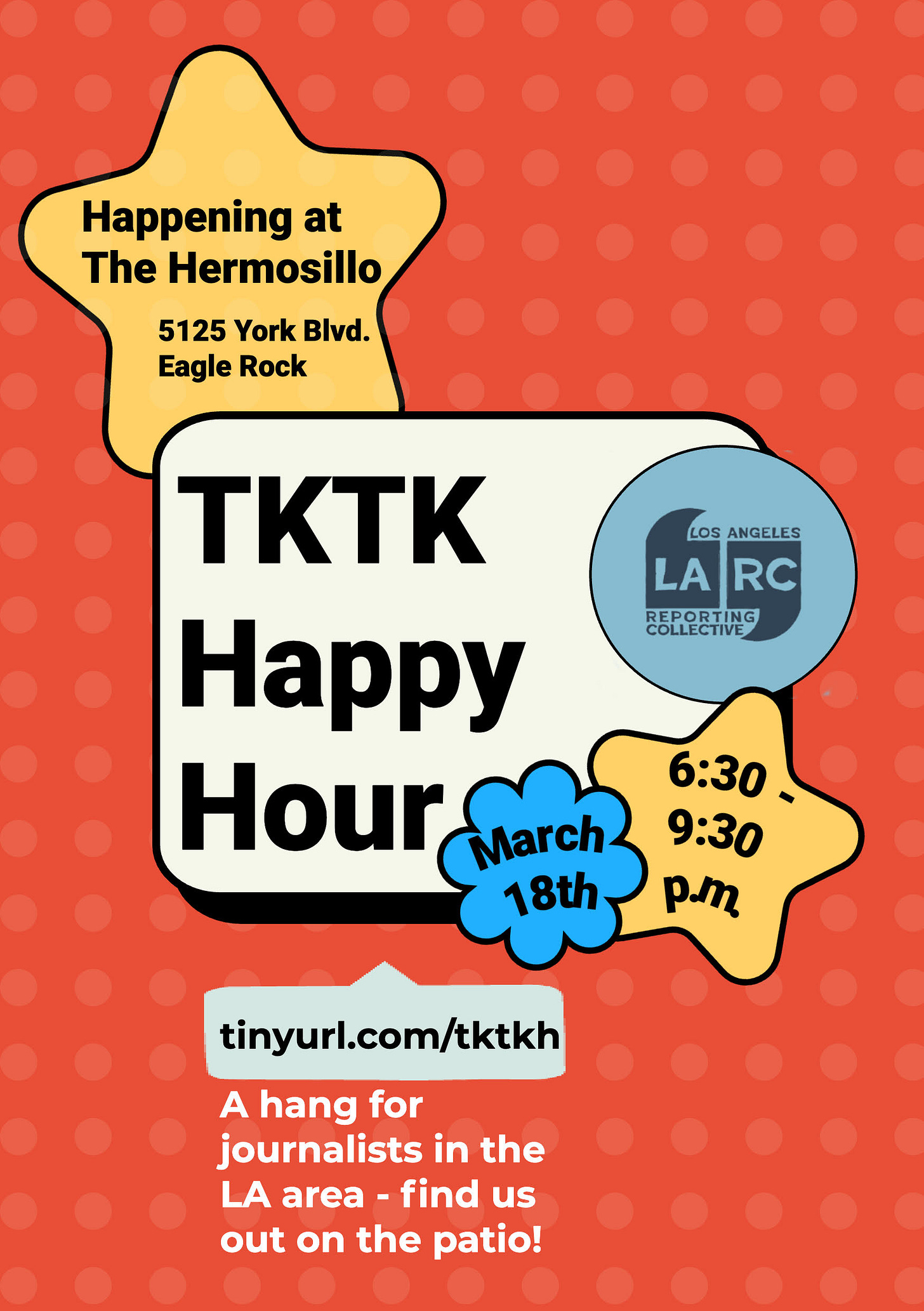 Then, on Wednesday March 18th, join TKTK and even more journo friends at The Hermosillo (a personal favorite, please get the fried pickles and a Pliny if you’re lucky) in Highland Park!